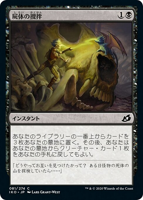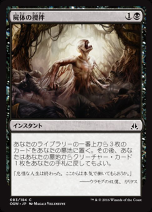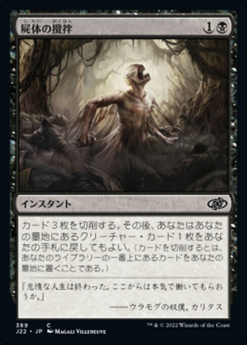 ![]() Variations— Parts— | 屍体の攪拌カードを3枚切削する。その後、あなたはあなたの墓地からクリーチャー・カード1枚をあなたの手札に戻してもよい。(カードを切削するとは、あなたのライブラリーの一番上からカードをあなたの墓地に置くことである。)