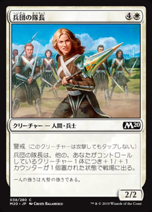 ![]() Variations— Parts— | 兵団の隊長2 / 2 警戒 兵団の隊長は、+1/+1カウンターが、他の、あなたがコントロールしているクリーチャー1体につき1個置かれた状態で戦場に出る。