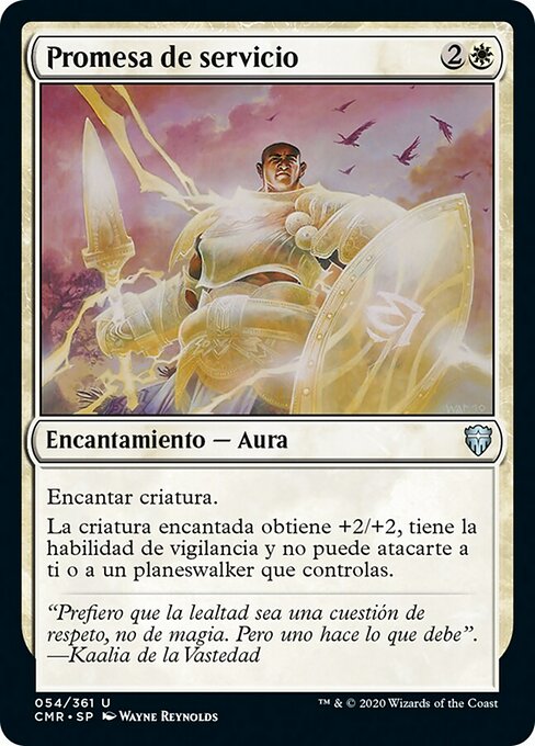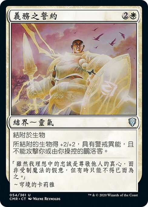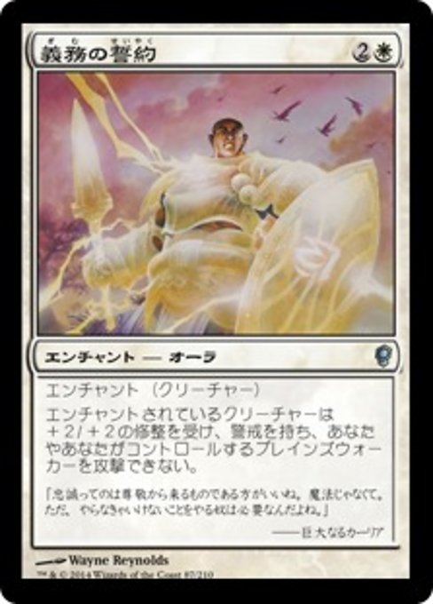 ![]() Variations— Parts— | 義務の誓約エンチャント(クリーチャー) エンチャントしているクリーチャーは+2/+2の修整を受け、警戒を持ち、あなたやあなたがコントロールしているプレインズウォーカーを攻撃できない。