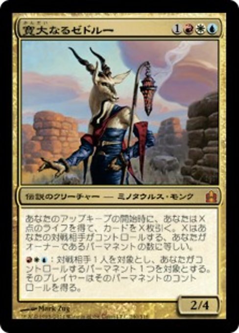 |  Variations— Parts— | 寛大なるゼドルー2 / 4 あなたのアップキープの開始時に、あなたはX点のライフを得て、カードをX枚引く。Xは、あなたがオーナーであり対戦相手がコントロールしているパーマネントの総数に等しい。