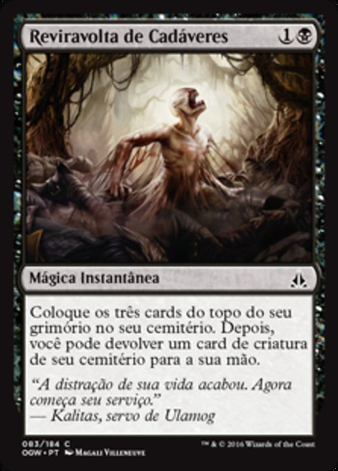 ![]() Variations— Parts— | Reviravolta de CadáveresTriture três cards. Em seguida, você pode devolver um card de criatura de seu cemitério para sua mão. (Para triturar um card, coloque o card do topo de seu grimório em seu cemitério.)