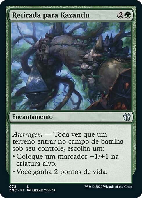 ![]() Variations— Parts— | Retirada para KazanduAterragem — Toda vez que um terreno entrar no campo de batalha sob seu controle, escolha um — • Coloque um marcador +1/+1 na criatura alvo. • Você ganha 2 pontos de vida.