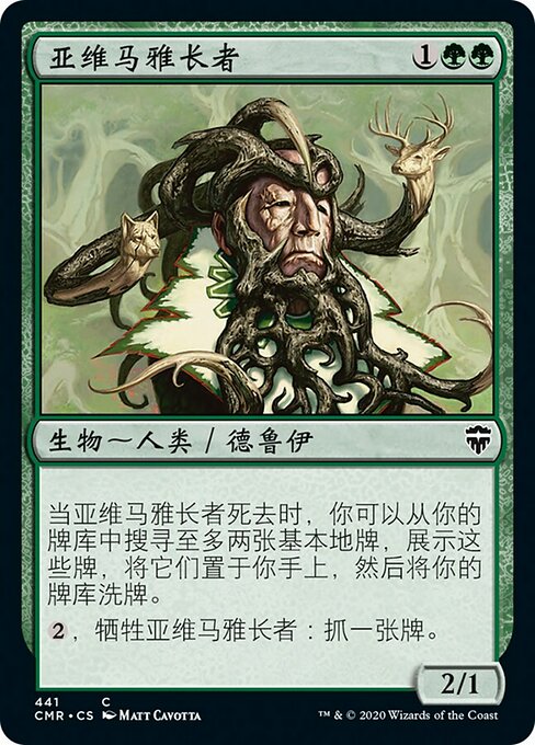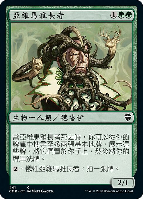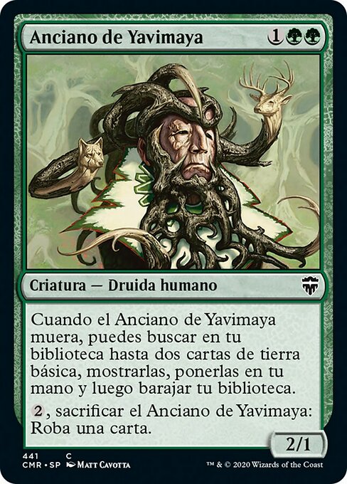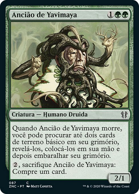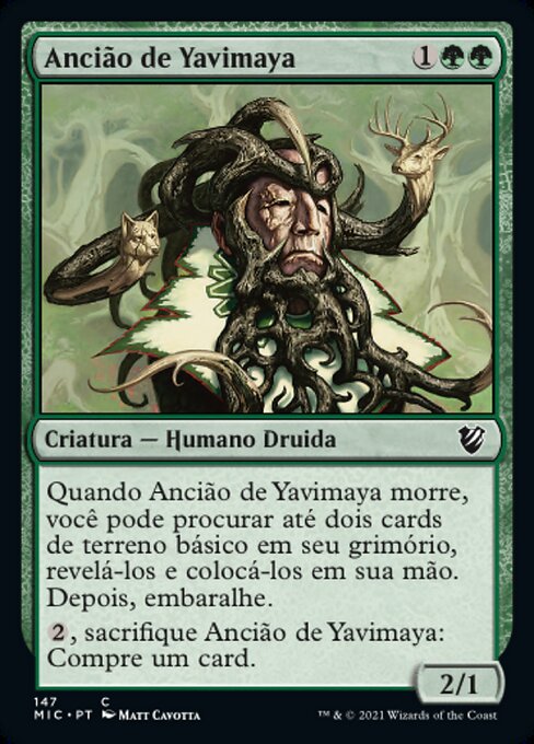 |  Variations— Parts— | Ancião de Yavimaya2 / 1 Quando Ancião de Yavimaya morre, você pode procurar até dois cards de terreno básico em seu grimório, revelá-los, colocá-los em sua mão e depois embaralhar seu grimório.