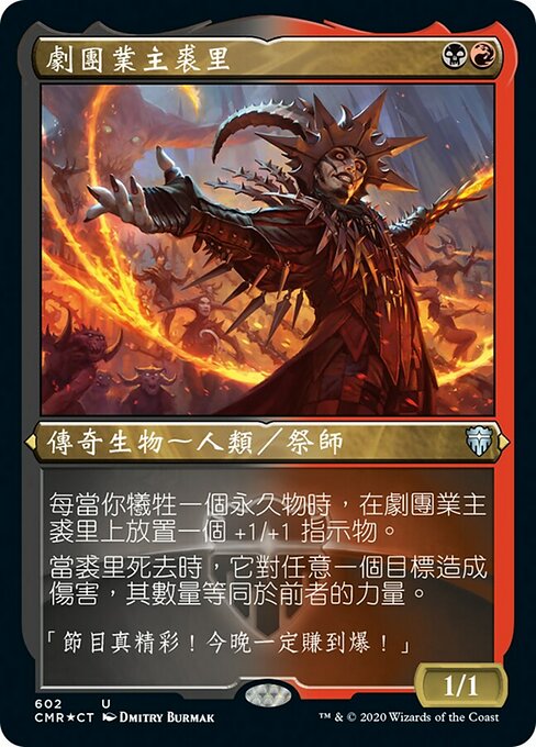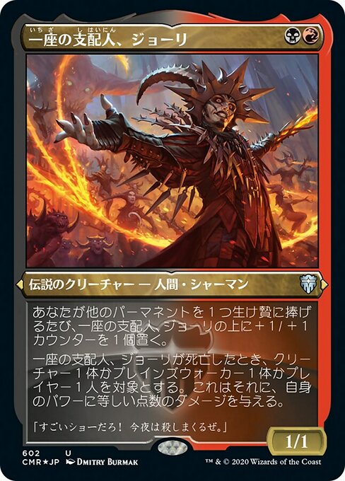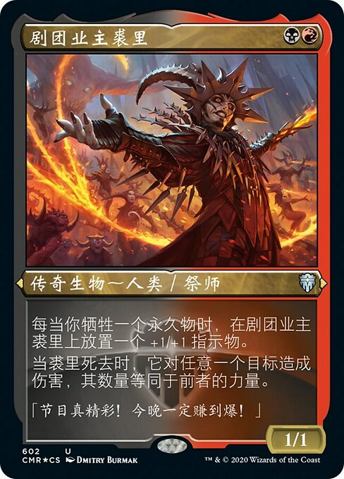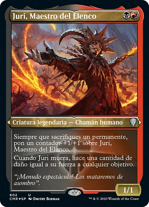 |  Variations : 1Parts— | Juri, Mestre da Trupe1 / 1 Toda vez que você sacrificar uma permanente, coloque um marcador +1/+1 em Juri, Mestre da Trupe. Quando Juri morre, ele causa uma quantidade de dano igual ao próprio poder a qualquer alvo.