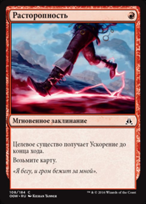 ![]() Variations— Parts— | РасторопностьЦелевое существо получает Ускорение до конца хода. Возьмите карту.