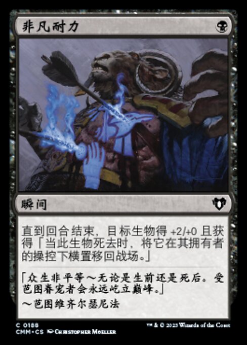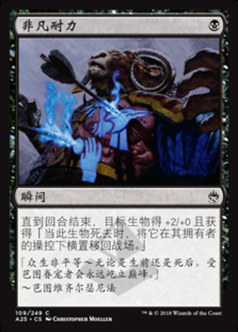 |  Variations— Parts— | 非凡耐力直到回合结束,目标生物得+2/+0且获得「当此生物死去时,将它在其拥有者的操控下横置移回战场。」