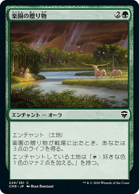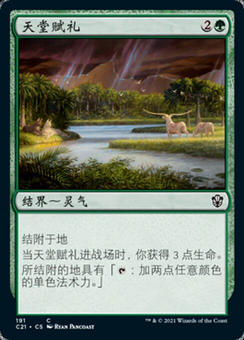 ![]() Variations— Parts— | 天堂赋礼结附于地 当天堂赋礼进战场时,你获得3点生命。 所结附的地具有「