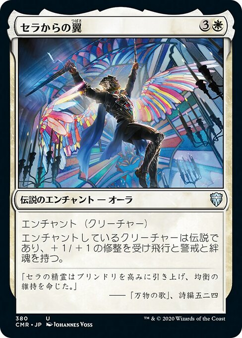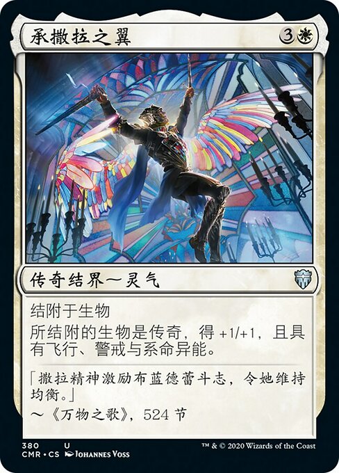 ![]() Variations— Parts— | 承撒拉之翼结附于生物 所结附的生物是传奇,得+1/+1,且具有飞行、警戒与系命异能。
