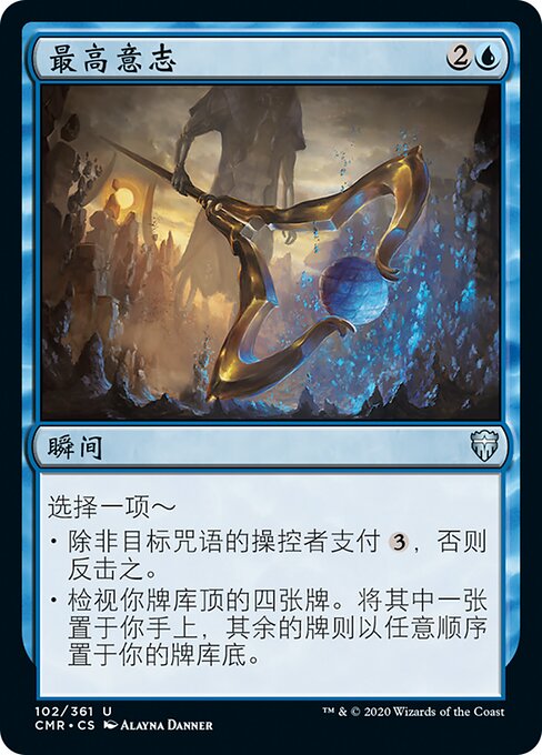 |  Variations— Parts— | 最高意志選擇一項~ •除非目標咒語的操控者支付 •檢視你牌庫頂的四張牌。將其中一張置於你手上,其餘的牌則以任意順序置於你的牌庫底。