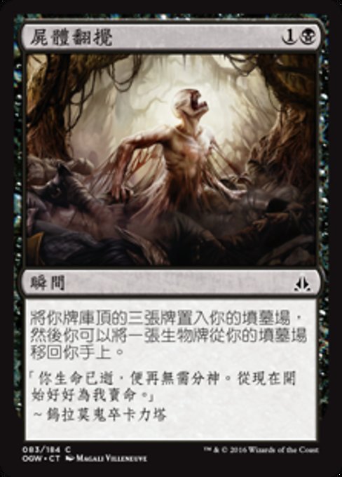 ![]() Variations— Parts— | 屍體翻攪磨三張牌,然後你可以將一張生物牌從你的墳墓場移回你手上。(磨一張牌的流程是將你牌庫頂的牌置入你的墳墓場。)