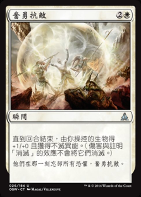 |  Variations— Parts— | 奮勇抗敵直到回合結束,由你操控的生物得+1/+0且獲得不滅異能。(傷害與註明「消滅」的效應不會將它們消滅。)