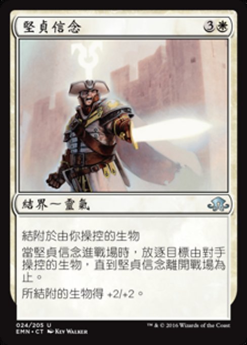 ![]() Variations— Parts— | 堅貞信念結附於由你操控的生物 當堅貞信念進戰場時,放逐目標由對手操控的生物,直到堅貞信念離開戰場為止。 所結附的生物得+2/+2。
