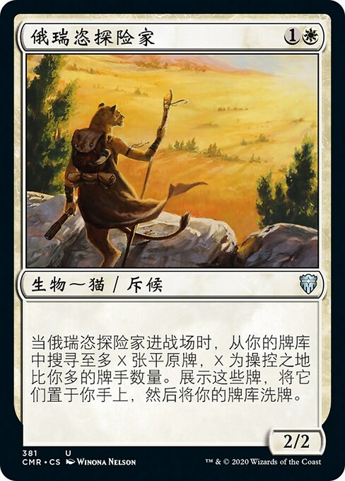 ![]() Variations— Parts— | 俄瑞恣探險家2 / 2 當俄瑞恣探險家進戰場時,從你的牌庫中搜尋至多X張平原牌,X為操控之地比你多的玩家數量。展示這些牌,將它們置於你手上,然後將你的牌庫洗牌。