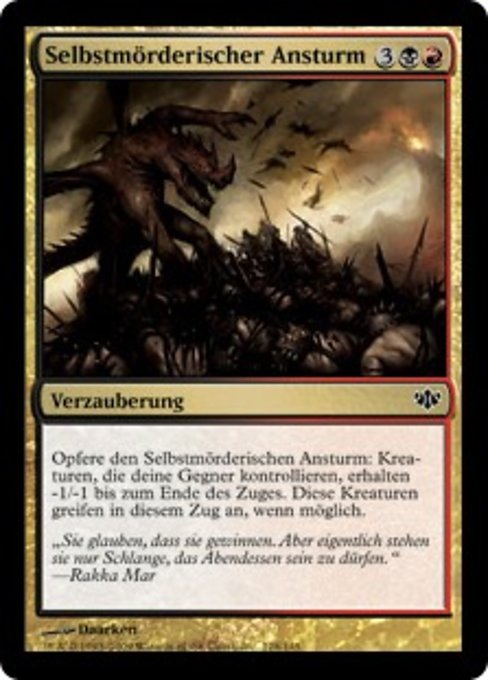 ![]() Variations— Parts— | Suicidal ChargeSacrifice this enchantment: Creatures your opponents control get -1/-1 until end of turn. Those creatures attack this turn if able.