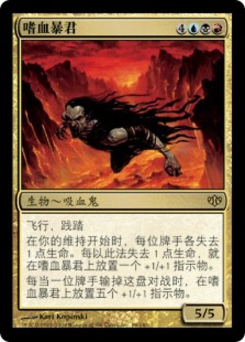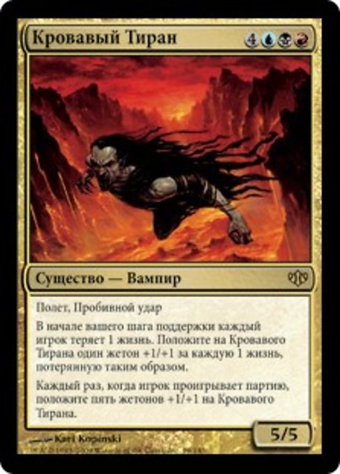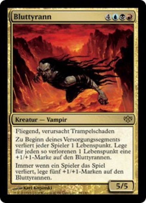 |  Variations— Parts— | Tirano sangriento5 / 5 Vuela, arrolla. Al comienzo de tu mantenimiento, cada jugador pierde 1 vida. Pon un contador +1/+1 sobre el Tirano sangriento por cada 1 vida perdida de esta manera. Siempre que un jugador pierda el juego, pon cinco contadores +1/+1 sobre el Tirano sangriento.