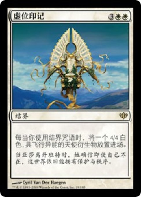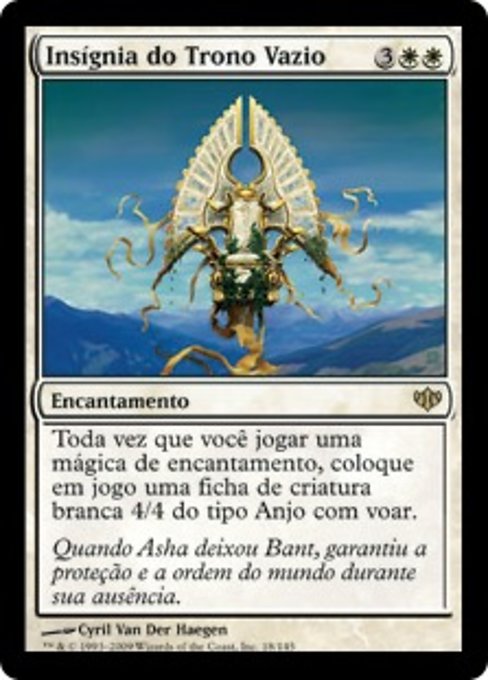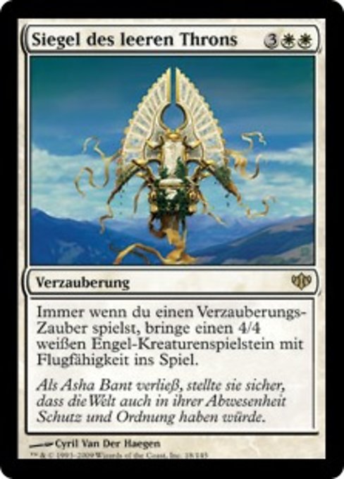 ![]() Variations— Parts— | Sigille du trône vacantÀ chaque fois que vous jouez un sort d'enchantement, mettez en jeu un jeton de créature 4/4 blanche Ange avec le vol.