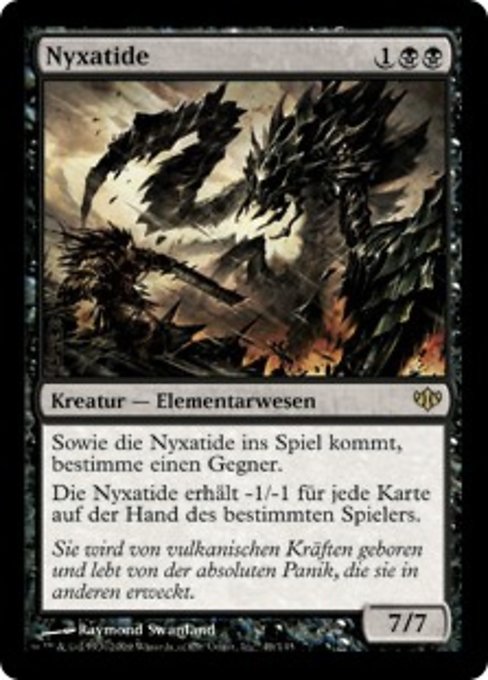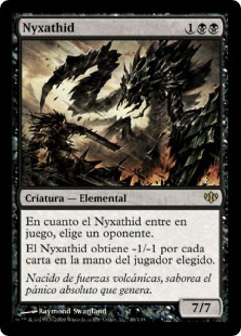 LegalitiesLegal Duel Brawl Penny Predh Legacy Modern Vintage Historic Timeless Commander Gladiator Oathbreaker Not Legal Future Pauper Alchemy Pioneer Standard Oldschool Premodern Standardbrawl Paupercommander RulingsNyxathid's two abilities are linked: The second one refers only to the player chosen by the first one. If another creature becomes a copy of Nyxathid (due to Mirrorweave, for example), the second ability won't do anything because a player was never chosen as a result of the first ability. This is true even if a different ability allowed a player to be chosen as that creature entered.