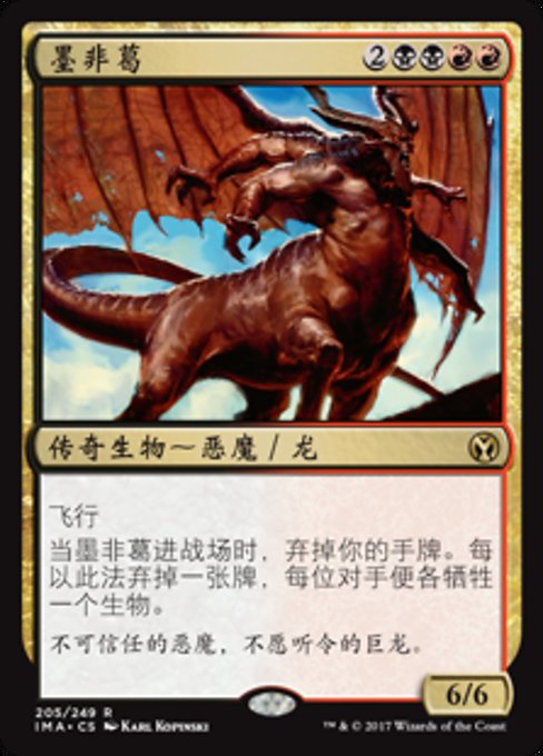 ![]() Variations— Parts— | 墨非葛6 / 6 飞行 当墨非葛进场时,弃掉你的手牌。 每以此法弃掉一张牌,每位对手便牺牲一个生物。