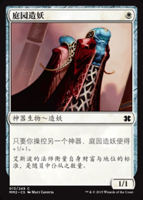 ![]() Variations— Parts— | 庭园造妖1 / 1 只要你操控另一个神器,庭园造妖便得+1/+1。