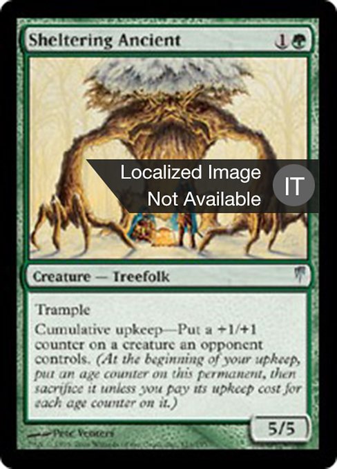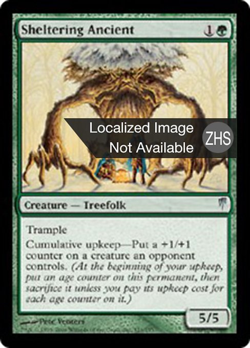 ![]() Variations— Parts— | Sheltering Ancient5 / 5 Trample Cumulative upkeep—Put a +1/+1 counter on a creature an opponent controls. (At the beginning of your upkeep, put an age counter on this permanent, then sacrifice it unless you pay its upkeep cost for each age counter on it.)
