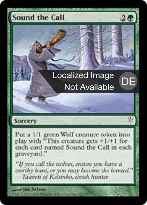 ![]() Variations— Parts— | Sound the CallCreate a 1/1 green Wolf creature token. It has "This token gets +1/+1 for each card named Sound the Call in each graveyard."