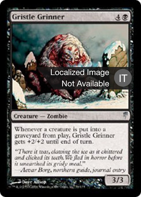 ![]() Variations— Parts— | Gristle Grinner3 / 3 Whenever a creature dies, this creature gets +2/+2 until end of turn.