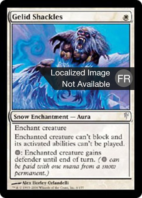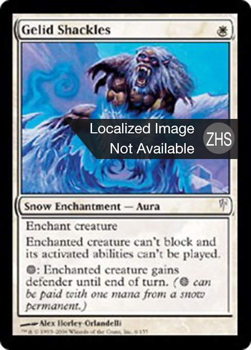 ![]() Variations— Parts— | Gelid ShacklesEnchant creature Enchanted creature can't block, and its activated abilities can't be activated.