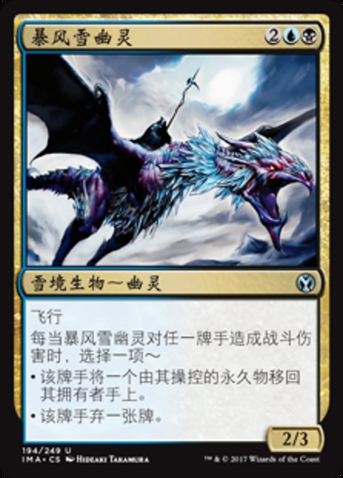 |  Variations— Parts— | 暴风雪幽灵2 / 3 飞行 每当暴风雪幽灵对任一牌手造成战斗伤害时,选择一项~该牌手将由他操控的一个永久物移回其拥有者手上;或该牌手弃一张牌。