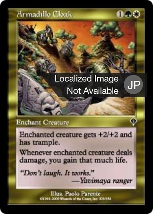 ![]() Variations— Parts— | アルマジロの外套エンチャント(クリーチャー) エンチャントされているクリーチャーは、+2/+2の修整を受けるとともにトランプルを持つ。 エンチャントされているクリーチャーがダメージを与えるたび、あなたはそれに等しい点数のライフを得る。