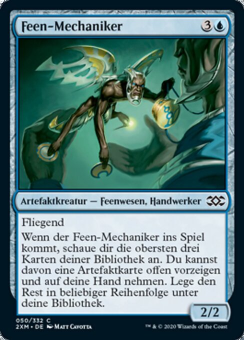 ![]() Variations— Parts— | Feen-Mechaniker2 / 2 Fliegend Wenn der Feen-Mechaniker ins Spiel kommt, schaue dir die obersten drei Karten deiner Bibliothek an. Du kannst eine Artefaktkarte darunter offen vorzeigen und sie auf deine Hand nehmen. Lege den Rest in beliebiger Reihenfolge unter deine Bibliothek.