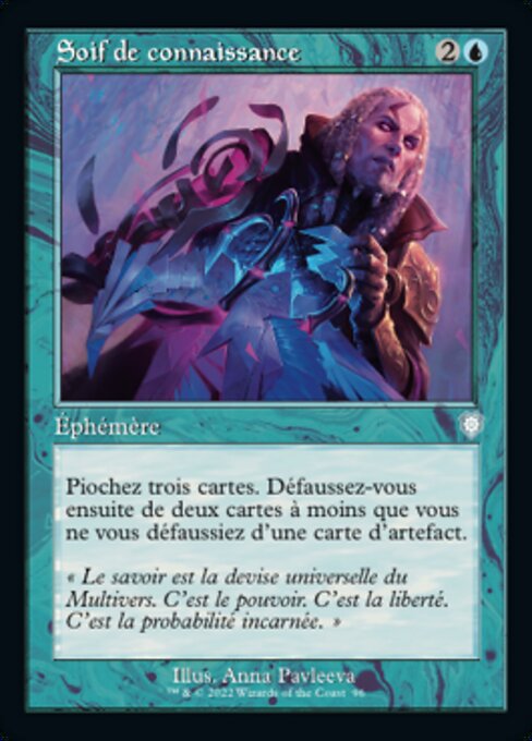 ![]() Variations— Parts— | Soif de connaissancePiochez trois cartes. Défaussez-vous ensuite de deux cartes à moins que vous ne vous défaussiez d'une carte d'artefact.