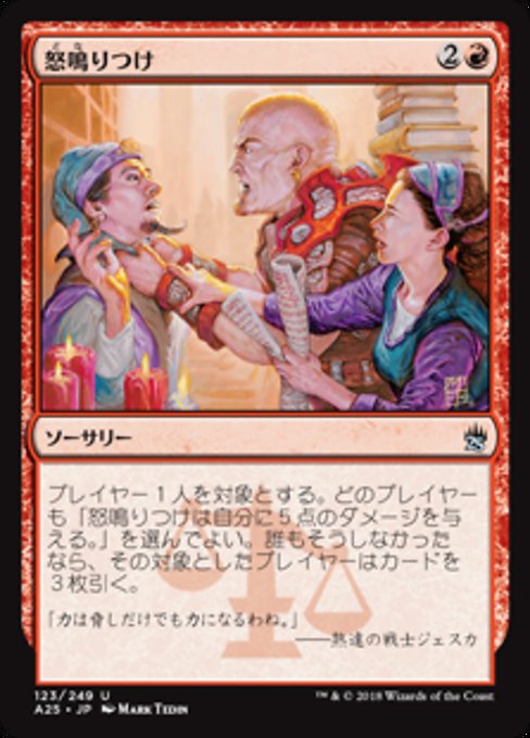 |  Variations— Parts— | 怒鳴りつけプレイヤー1人を対象とする。いずれのプレイヤーも、「怒鳴りつけは自分に5点のダメージを与える。」を選んでよい。誰もそうしなかった場合、そのプレイヤーはカードを3枚引く。
