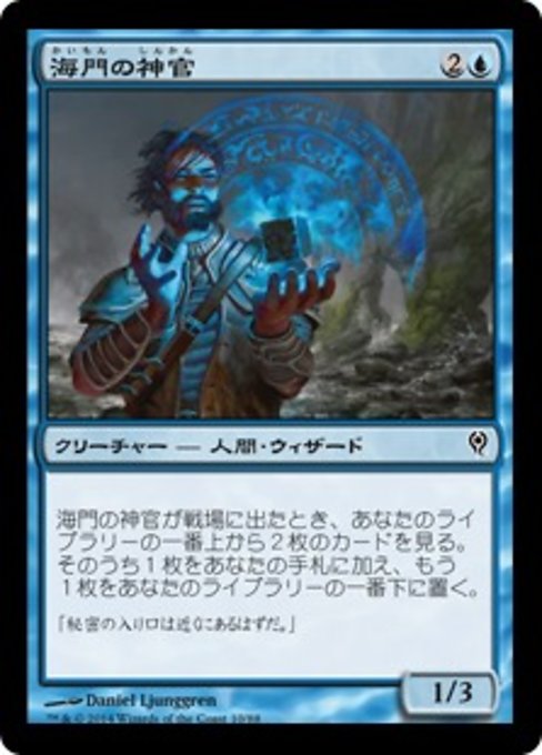 ![]() Variations— Parts— | Sea Gate Oracle1 / 3 When this creature enters, look at the top two cards of your library. Put one of them into your hand and the other on the bottom of your library.