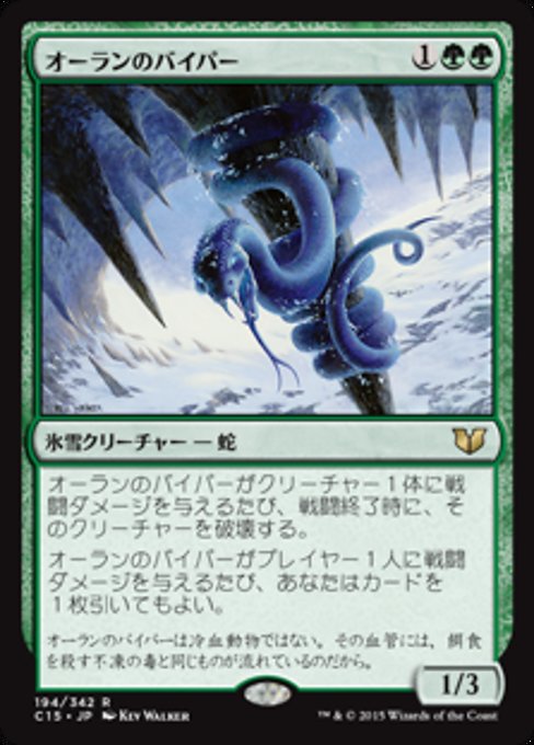 ![]() Variations— Parts— | オーランのバイパー1 / 3 オーランのバイパーがクリーチャー1体に戦闘ダメージを与えるたび、戦闘終了時にそのクリーチャーを破壊する。 オーランのバイパーがプレイヤー1人に戦闘ダメージを与えるたび、あなたはカードを1枚引いてもよい。