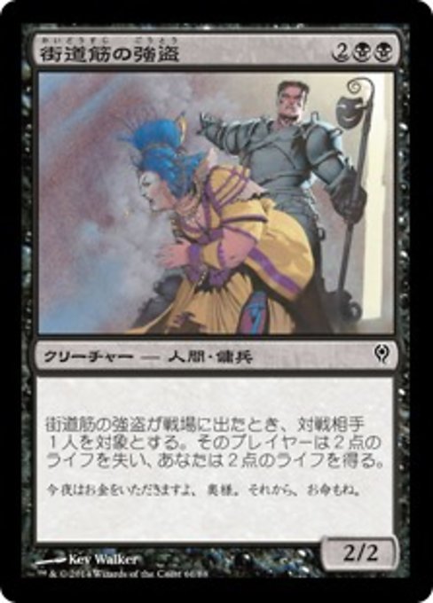 ![]() Variations— Parts— | 街道筋の強盗2 / 2 街道筋の強盗が戦場に出たとき、対戦相手1人を対象とする。そのプレイヤーは2点のライフを失い、あなたは2点のライフを得る。