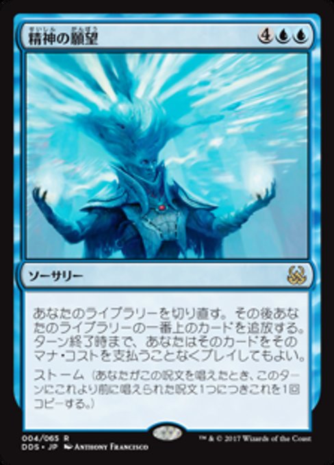 ![]() Variations— Parts— | 精神の願望あなたのライブラリーを切り直す。その後あなたのライブラリーの一番上のカードを追放する。ターン終了時まで、あなたはそのカードをそのマナ・コストを支払うことなくプレイしてもよい。 ストーム(あなたがこの呪文を唱えたとき、このターンにこれより前に唱えられた呪文1つにつきこれを1回コピーする。)