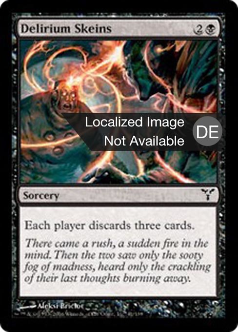 LegalitiesLegal Duel Predh Legacy Modern Pauper Vintage Commander Oathbreaker Paupercommander Penny Not Legal Brawl Penny Future Alchemy Pioneer Historic Standard Timeless Gladiator Oldschool Premodern Standardbrawl RulingsWhen Delirium Skeins resolves, first the player whose turn it is chooses three cards to discard, then each other player in turn order chooses three cards to discard, then all of those cards are discarded simultaneously. No one sees what the other players are discarding before deciding which cards to discard.