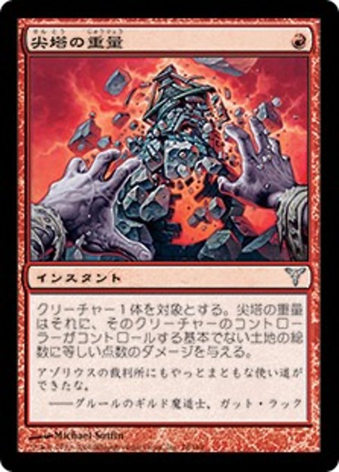 |  Variations— Parts— | Weight of SpiresWeight of Spires deals damage to target creature equal to the number of nonbasic lands that creature's controller controls.
