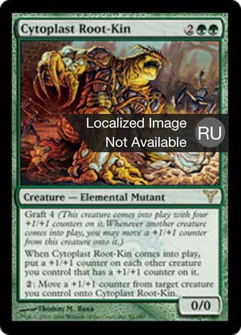 ![]() Variations— Parts— | Cytoplast Root-Kin0 / 0 Graft 4 (This creature enters with four +1/+1 counters on it. Whenever another creature enters, you may move a +1/+1 counter from this creature onto it.) When this creature enters, put a +1/+1 counter on each other creature you control with a +1/+1 counter on it.