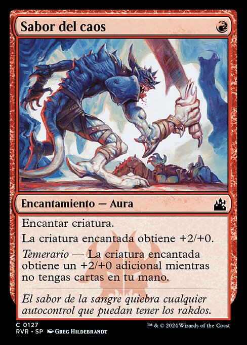 |  Variations— Parts— | Sabor del caosEncantar criatura. La criatura encantada obtiene +2/+0. Temerario La criatura encantada obtiene un +2/+0 adicional mientras no tengas cartas en tu mano.