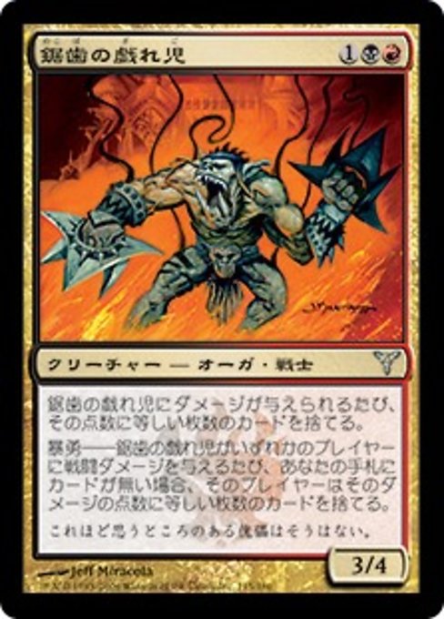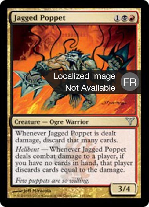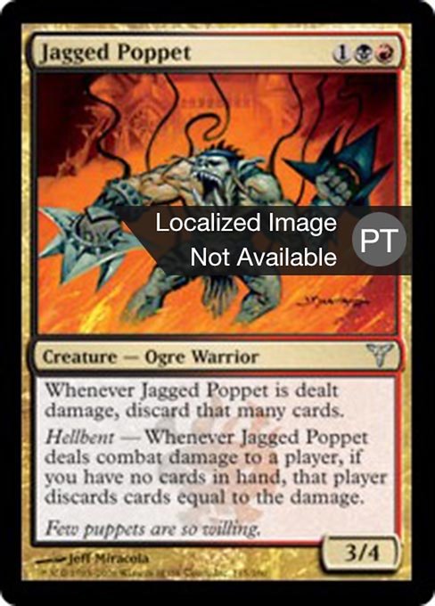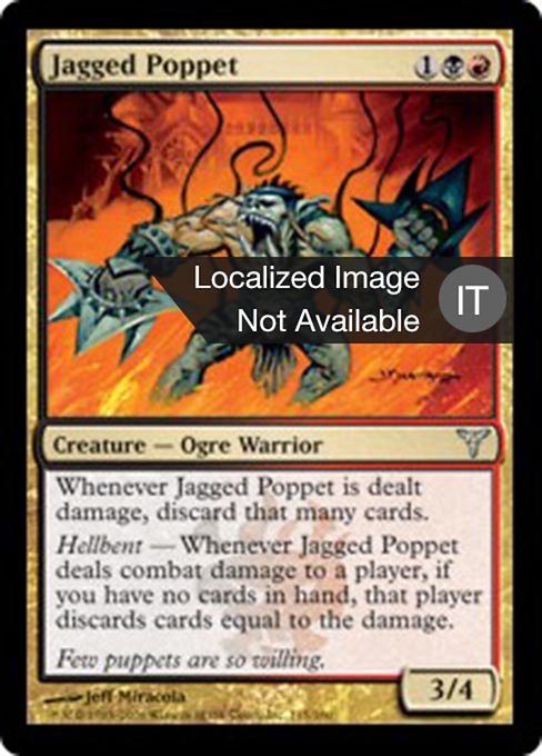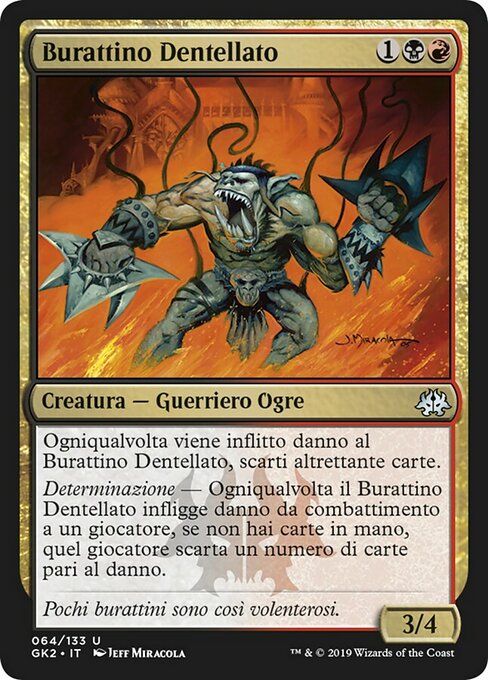 |  Variations— Parts— | Burattino Dentellato3 / 4 Ogniqualvolta viene inflitto danno al Burattino Dentellato, tu scarti altrettante carte. Determinazione Ogniqualvolta il Burattino Dentellato infligge danno da combattimento a un giocatore, se non hai carte in mano, quel giocatore scarta un numero di carte pari al danno.