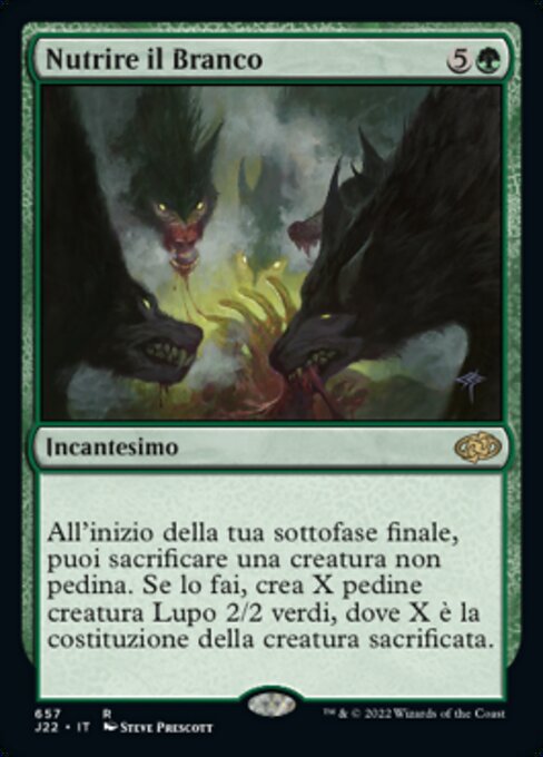 |  Variations— Parts— | Nutrire il BrancoAll'inizio della tua sottofase finale, puoi sacrificare una creatura non pedina. Se lo fai, metti sul campo di battaglia X pedine creatura Lupo 2/2 verdi, dove X è la costituzione della creatura sacrificata.