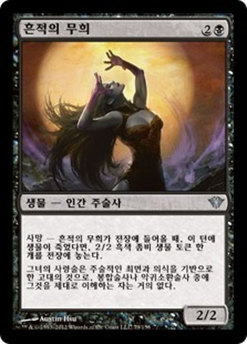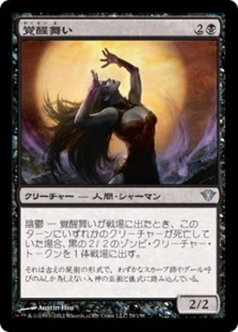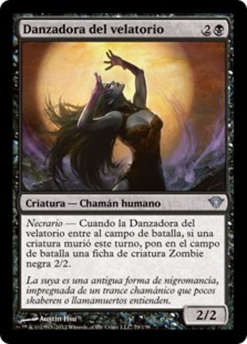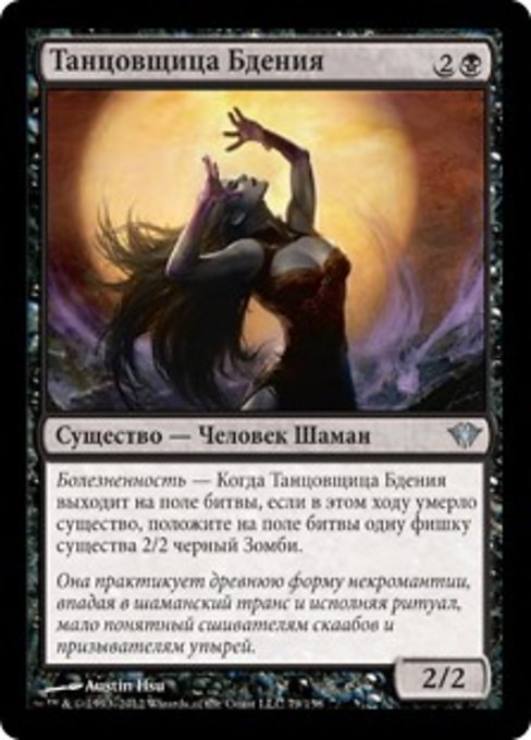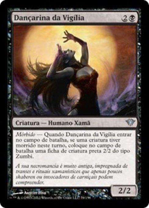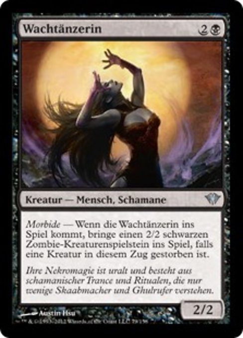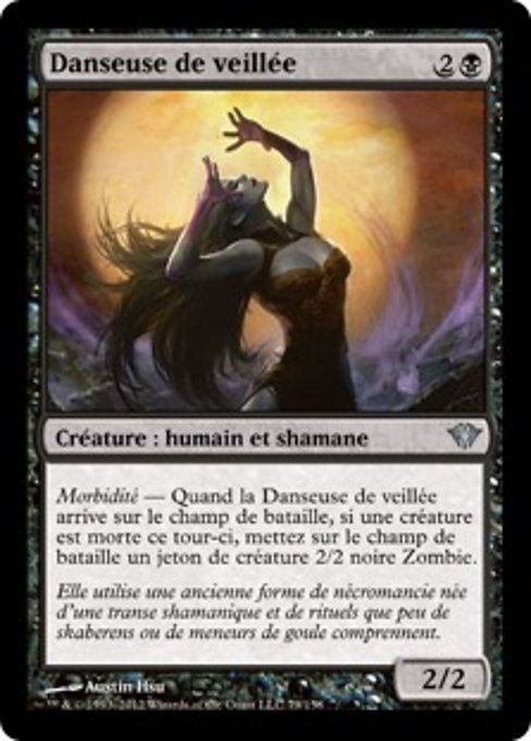 |  Variations— Parts— | Danzatrice della Veglia2 / 2 Morboso — Quando la Danzatrice della Veglia entra nel campo di battaglia, se è morta una creatura in questo turno, metti sul campo di battaglia una pedina creatura Zombie 2/2 nera.