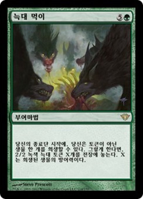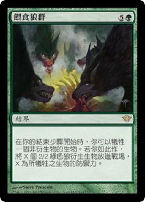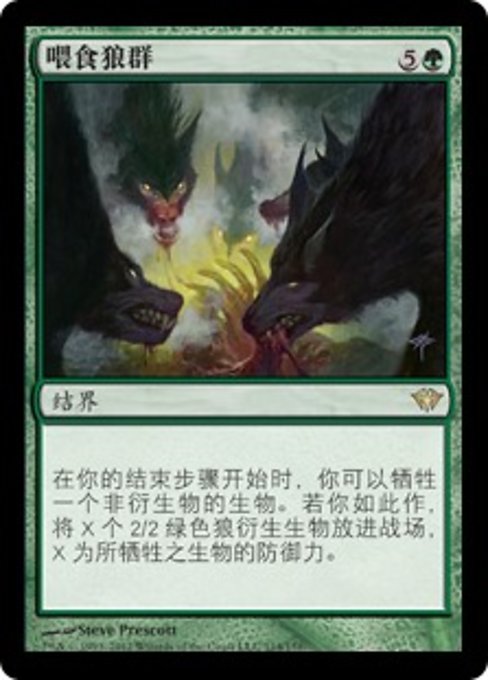 ![]() Variations— Parts— | 喂食狼群在你的结束步骤开始时,你可以牺牲一个非衍生物的生物。若你如此作,将X个2/2绿色狼衍生生物放进战场,X为所牺牲之生物的防御力。