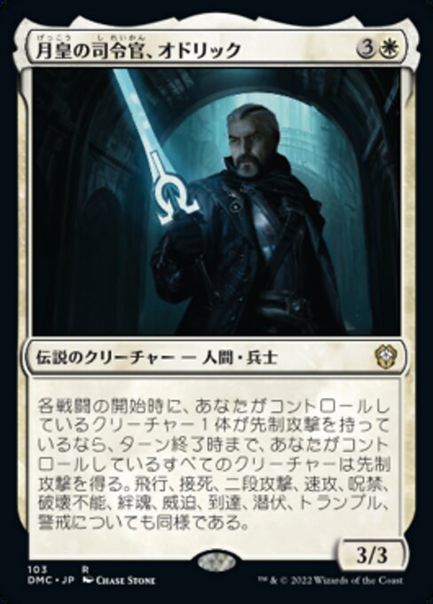 |  Variations— Parts— | Odric, mariscal lunarca3 / 3 Al comienzo de cada combate, las criaturas que controlas ganan la habilidad de dañar primero hasta el final del turno si una criatura que controlas daña primero. Lo mismo vale para las habilidades de volar, toque mortal, dañar dos veces, prisa, antimaleficio, indestructible, vínculo vital, amenaza, alcance, escurridizo, arrollar y vigilancia.