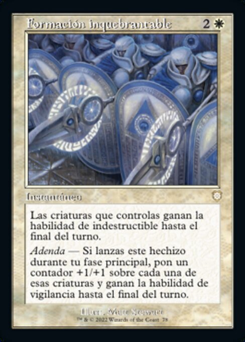|  Variations— Parts— | Formación inquebrantableLas criaturas que controlas ganan la habilidad de indestructible hasta el final del turno. Adenda — Si lanzas este hechizo durante tu fase principal, pon un contador +1/+1 sobre cada una de esas criaturas y ganan la habilidad de vigilancia hasta el final del turno.