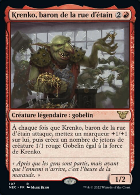 |  Variations— Parts— | Krenko, baron de la rue d'étain1 / 2 À chaque fois que Krenko, baron de la rue d'étain attaque, mettez un marqueur +1/+1 sur lui, puis créez un nombre de jetons de créature 1/1 rouge Gobelin égal à la force de Krenko.