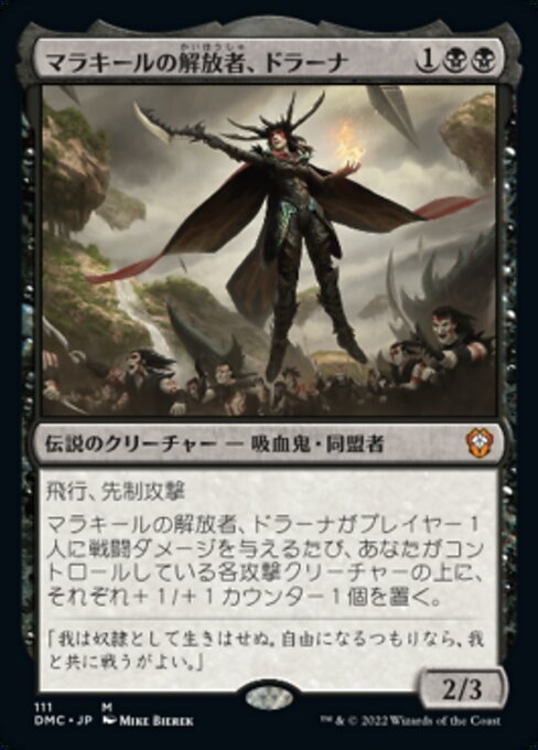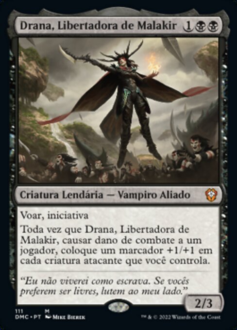 ![]() Variations— Parts— | Drana, Liberatrice di Malakir2 / 3 Volare, attacco improvviso Ogniqualvolta Drana, Liberatrice di Malakir infligge danno da combattimento a un giocatore, metti un segnalino +1/+1 su ogni creatura attaccante che controlli.