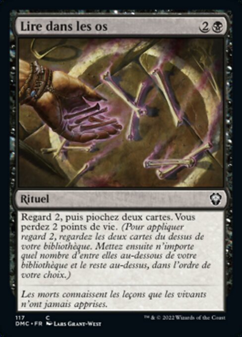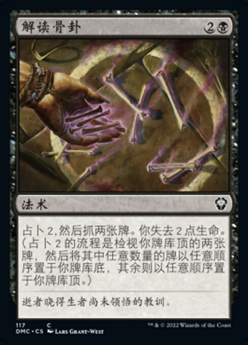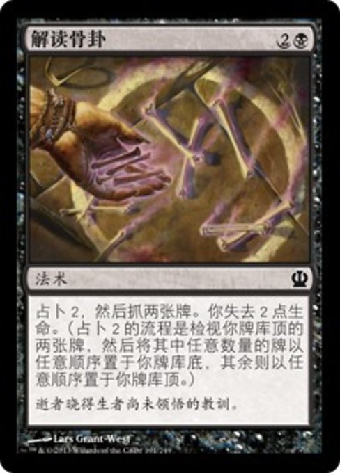 |  Variations— Parts— | 解读骨卦占卜2,然后抓两张牌。你失去2点生命。(占卜2的流程是检视你牌库顶的两张牌,然后将其中任意数量的牌以任意顺序置于你牌库底,其余则以任意顺序置于你牌库顶。)