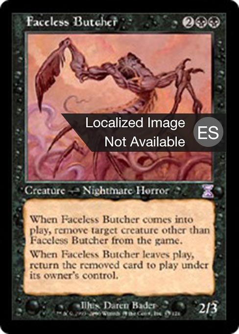 ![]() Variations— Parts— | Carnicero sin rostro2 / 3 Cuando el Carnicero sin rostro entre al campo de batalla, exilia otra criatura objetivo. Cuando el Carnicero sin rostro deje el campo de batalla, regresa la carta exiliada al campo de batalla bajo el control de su propietario.